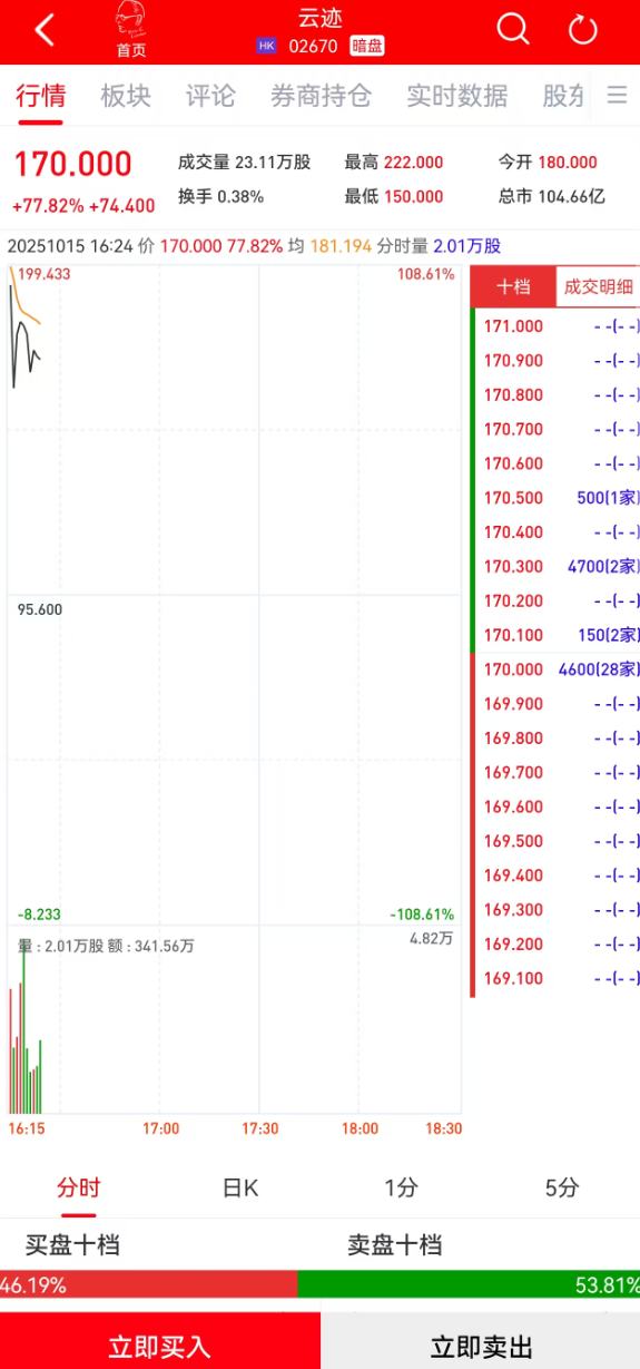 云迹(02670)将于10月16日(周四)在香港挂牌。截至发稿,利弗莫尔证券暗盘交易显示报价170港元,较招股价95.6港元上涨77.82%,每手50股,不计手续费,每手赚3720港元。